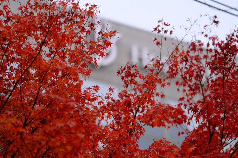 紅葉と建物のコントラストがこの季節ならではの風景を描き出します。