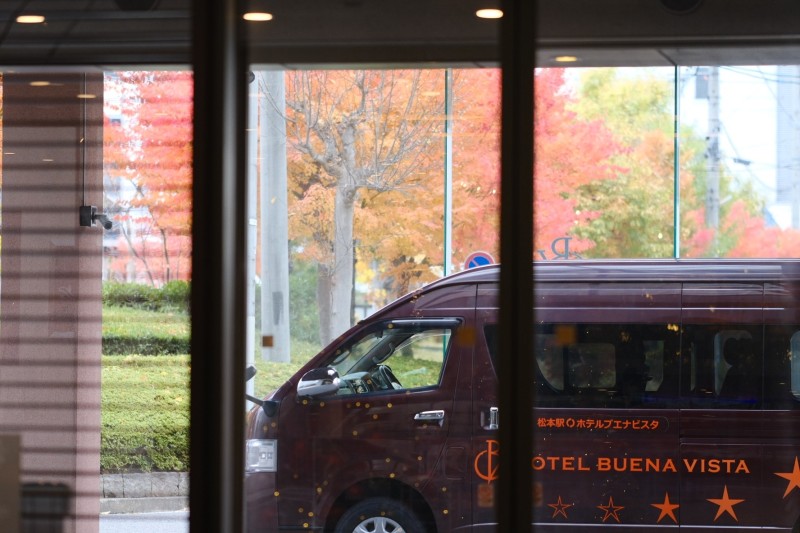 臙脂色のホテルシャトルバス越しに見える紅葉は、